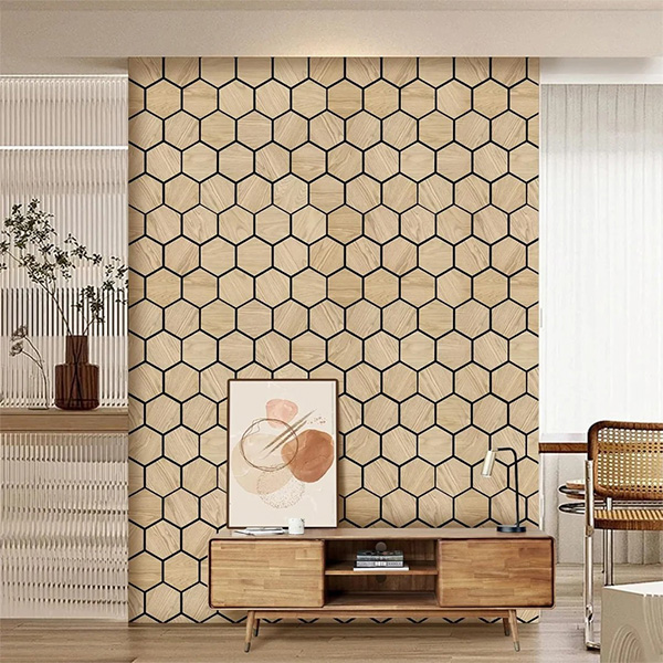 Panel hiasan dengan permukaan kayu, fabrik dan PET.
